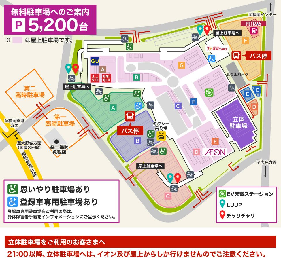 【⽴体駐⾞場をご利⽤のお客様へ】21時以降は⽴体駐⾞場へは、イオン及び屋上からしか⾏けませんので、ご注意ください。